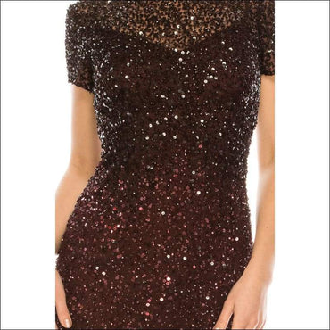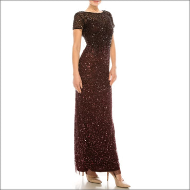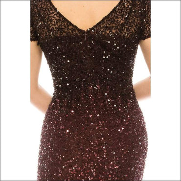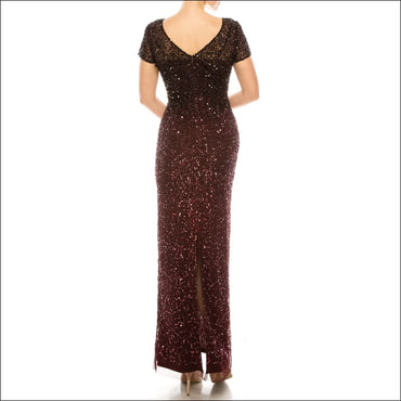 Dazzling sequins and a stunning silhouette makes this dark burgundy column evening dress by Adrianna Papell a true showstopper. Attend your next formal event in style and show off this dress' features, such as its black to burgundy ombre beading and sequining, its sheer upper bodice and short sleeves, its low V back, and its back slit. Grab yours now!
