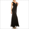 Starting with its allover diamond-patterned soutache design, this black Aidan Mattox mesh evening dress also features slight cap sleeves, a plunging neckline with a mesh insert, and a slimming column silhouette.