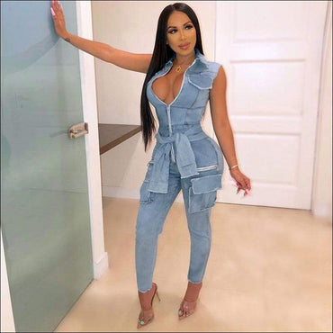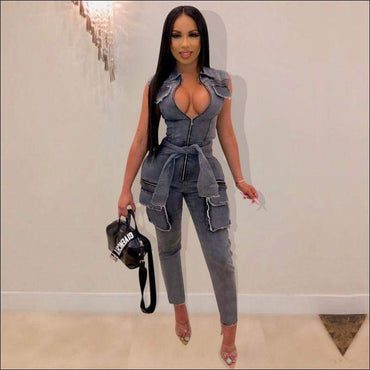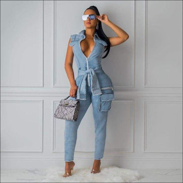 Casual V Neck Zipper Pattern Overall Jumpsuits