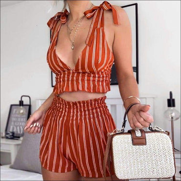 Deep V Neck Stripes Print Cropped Tank Top Ruffled Defined Waist Shorts Two-piece Set