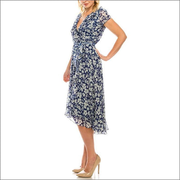 A cute floral printed faux wrap dress by Gabby Skye showcases a ruffled neckline and bottom and a matching belt to add an extra flirty flair and an emphasis on a smaller waist. This dress is just so perfect for a casual events. Get yours now!