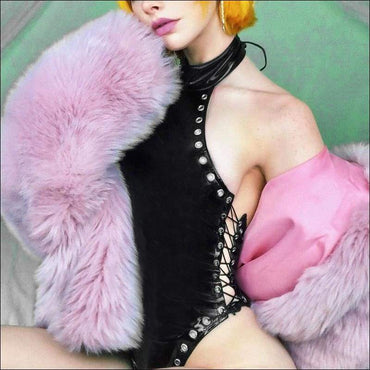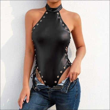 Halter Neck Lace-Up Sleeveless PU Bodysuits