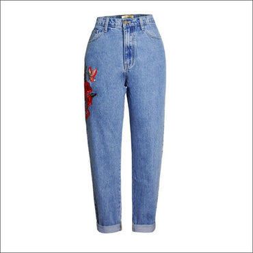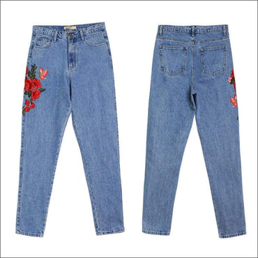 High Rise Straight Jeans Red Flower Embroider In Side Leg Design