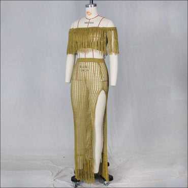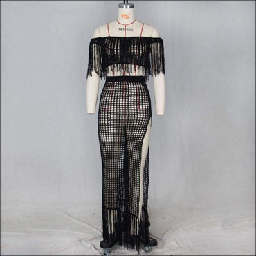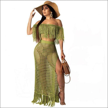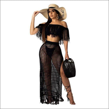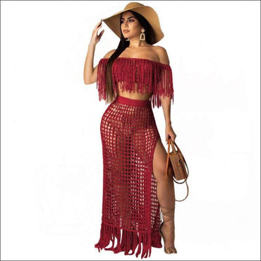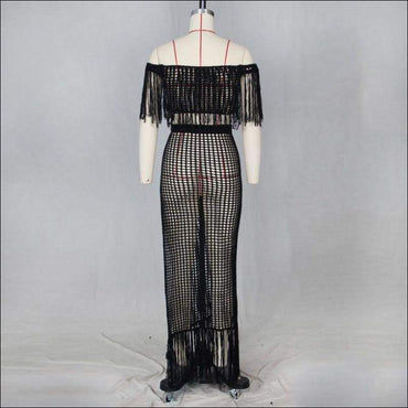Hollow Out Tassels Design Off-the-shoulder Crop Top Loose Skirt Knit Set