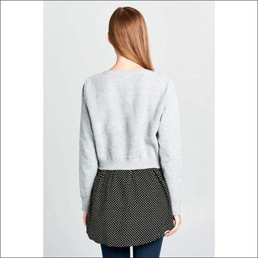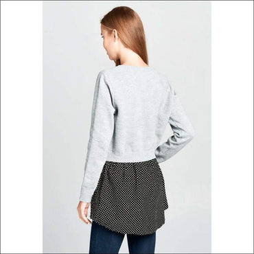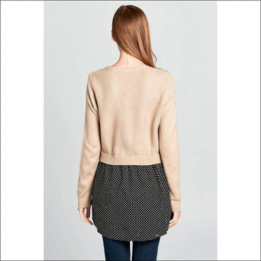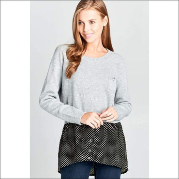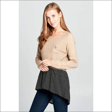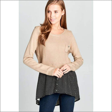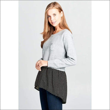 This Long Sleeve knit top is warm and cozy. This top has its bottom polka dot that looks like you were wearing an underlayer. Grab this top now!