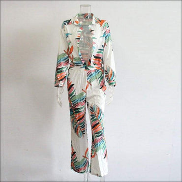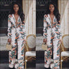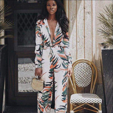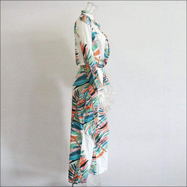 Leaf Print Defined Waist V-neck Long-sleeve