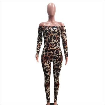 Leopard Long-sleeve Tight Off Shoulder Jumpsuits