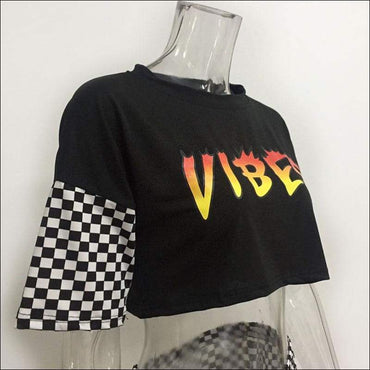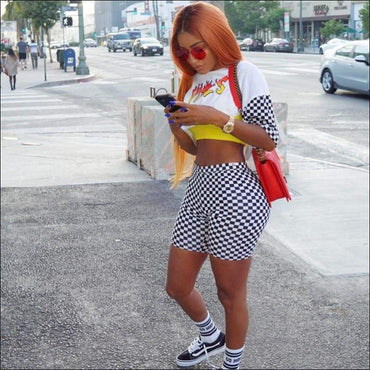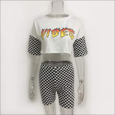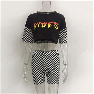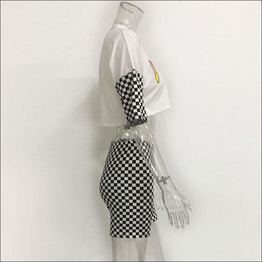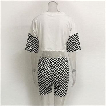 Letter Print Round Neckline Tee And Tight Plaid Shorts Two Pieces Sets