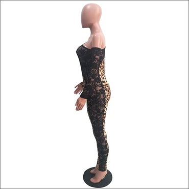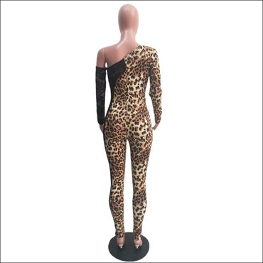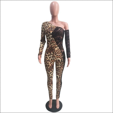 Long-sleeve Leopard Lace Patchwork Oblique Shoulder Tight Jumpsuits