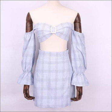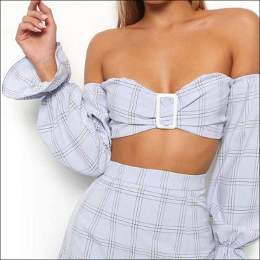 Off-the-shoulder Checkered Print Crop Top High-waisted A-line Skirt Set