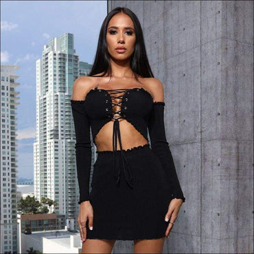 Off-the-shoulder Lace-up Long-sleeve Crop Top Ruffled Tight Skirt Two-piece Set