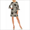 A cute and chic black ivory crepe dress by Sandra Darren has an all-over print of enlarged plaid and black flowers. And the dress features 3/4 bell sleeves with 2 mesh trims on each sleeve.